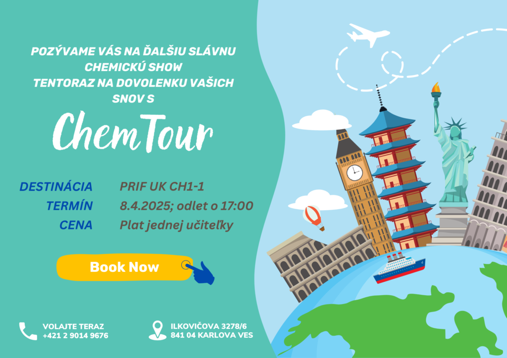 Srdečne pozývame všetkých učiteľov, študentov aj širokú verejnosť na tradičnú chemickú show študentov piateho ročníka učiteľstva chémie! Tento rok sa vydáme na nezabudnuteľnú dovolenkovú cestu (ak na to budú prostriedky) okolo sveta s ChemTour, kde vás čakajú dychberúce chemické pokusy, humor a štipka (ne)čakanej improvizácie. Príďte s nami preletieť svet laboratórnych zázrakov 8. apríla 2025 o 17:00 na Prírodovedeckej fakulte UK v miestnosti CH1-1. Tešíme sa na vás!